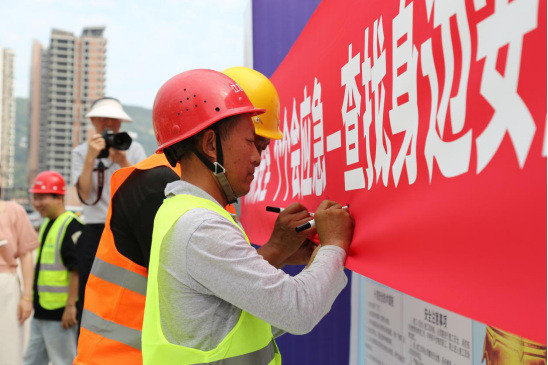 啟動儀式上,公司黨總支副書記、總經(jīng)理馮皓代表業(yè)主單位致辭,宣布安全生產(chǎn)月活動正式啟動。馮皓強(qiáng)調(diào)安全生產(chǎn)對項(xiàng)目建設(shè)的重要性,要求全體人員將安全理念貫穿工作始終,積極參與各項(xiàng)安全活動。并特別指出,張家河生態(tài)修復(fù)項(xiàng)目承載著改善區(qū)域生態(tài)環(huán)境、造福一方百姓的重要使命。作為項(xiàng)目業(yè)主,深知安全生產(chǎn)不僅是項(xiàng)目順利推進(jìn)的基石、守護(hù)建設(shè)者生命安全的防線,更是踐行社會責(zé)任、保障生態(tài)修復(fù)事業(yè)高質(zhì)量發(fā)展的核心要義。隨后,施工單位代表領(lǐng)誓,宣讀了《安全生產(chǎn)誓詞》。緊接著,參與人員在“安全生產(chǎn)月”主題橫幅上簽名,以莊重的形式明確自身安全責(zé)任。